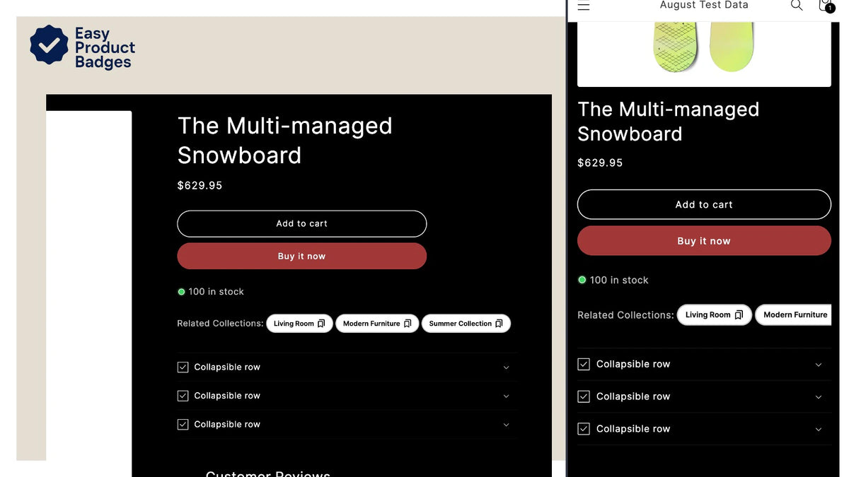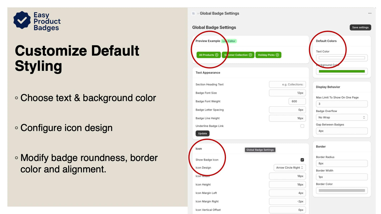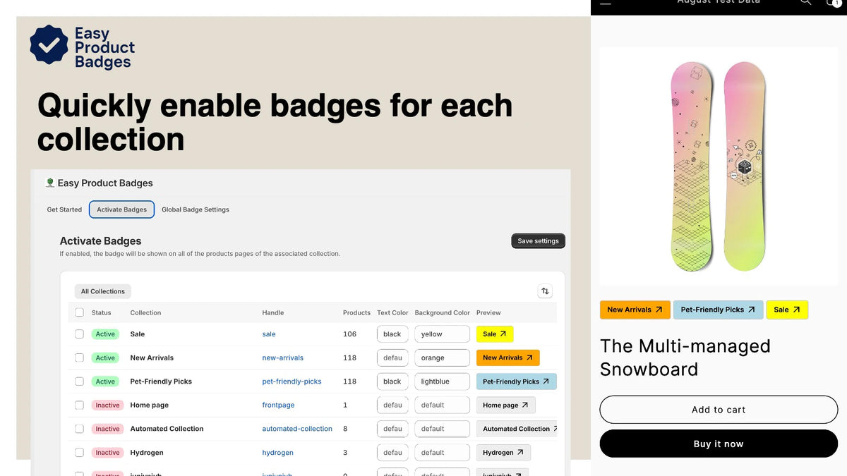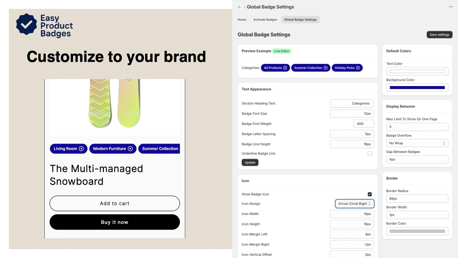 Control badge text, colors, and styling for each collection to match your brand and marketing goals.