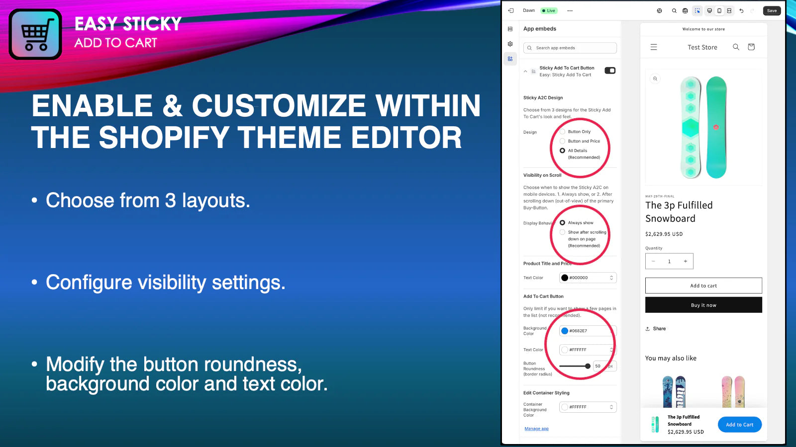 Fully customizable styling allows the Sticky Add to Cart button to blend seamlessly with your theme.